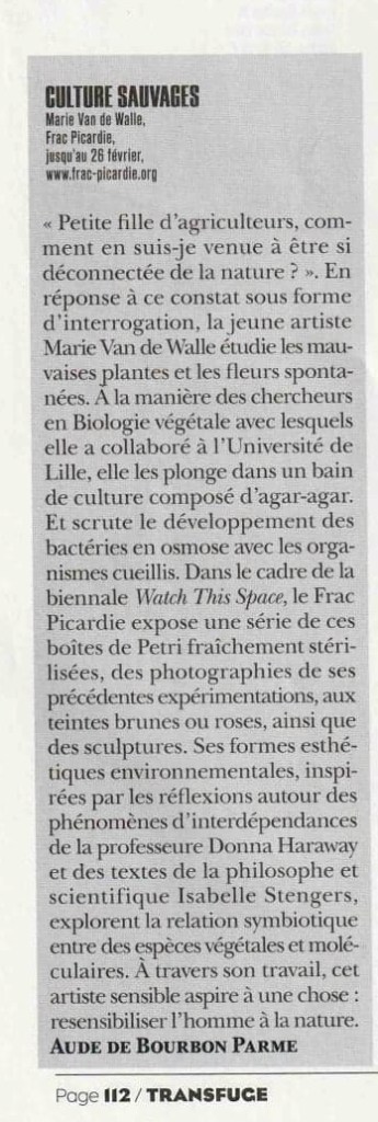 Marie Van de Walle cherche à mettre au point des propositions sensibles pour accroitre nos relations au vivant, et à la flore de proximité en particulier. Elle travaille avec les plantes sauvages car elles sont notre commun. En les rendant visibles et en travaillant avec, elle tente de changer notre curseur d’attention et d’accroitre nos relations et nos affects au végétal, pour aller vers une meilleure connaissance de notre environnement et questionner nos manières d’habiter et d’appréhender notre territoire.